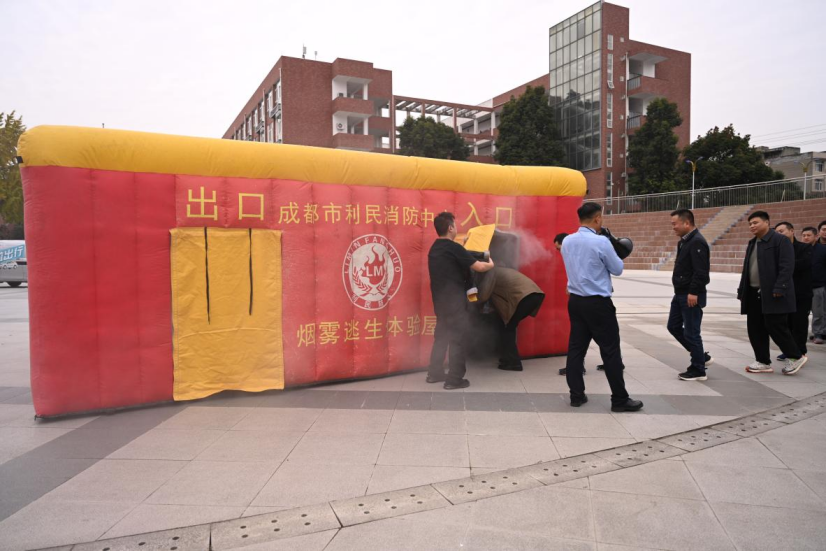 在诚信广场设置烟雾逃生舱,模拟真实火灾烟雾环境。师生依次进入体验,在工作人员指导下学习低姿弯腰、湿巾捂鼻等正确逃生方法,切实提升突发火情下的应急疏散能力。