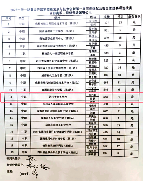 在中职组比赛中,30余支代表队同场竞技,最终19支队伍脱颖而出,成功晋级国赛。其中,我校23级计算机英才班的张艺轩和肖睿同学,在王灵香老师的悉心指导下,表现出色,以中职组第四名西部赛区二等奖的好成绩顺利获得国赛入场券。他们的成功,不仅为学校争得了荣誉,也为其他同学树立了榜样,彰显了我校计算机专业在技能人才培养方面的显著成效。