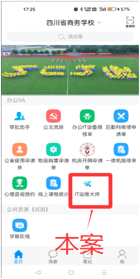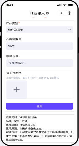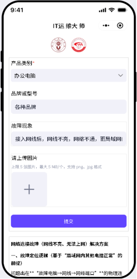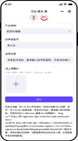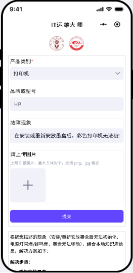 理论上大模型堪称“大师”而无所不能,而IT运维大师的核心创新在于其智能化运维模式。用户点击学校综合管理平台或超星学习通接口进入小程序应用,用“什么产品什么情况下发生什么故障现象”的叙事逻辑,提交文本,上传图片,系统即可自动优先检索知识库。如若检索失败,大模型将分析生成处理建议。