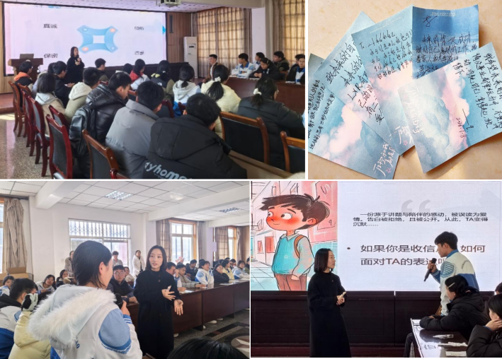胡文晗围绕青春期情感认知、人际边界建立、健康交往方式等核心内容展开叙述,通过科学的心理知识讲解、生动的案例分析和轻松的互动环节,引导学生理性认识自我情感,树立正确的交往观念。她以“肢体反应小测试”引发学生兴趣,直观揭示情感表达中的非语言信号,帮助学生理解身体语言在人际沟通中的意义从青春期的生理与心理基础入手,深入浅出地讲解了神经递质系统、大脑发育特点及心理成长阶段,为学生理解自身情感变化提供了科学依据。“友谊与边界”环节,胡文晗通过“冷却的友谊”等生动案例,剖析了边界模糊对人际关系的负面影响,并指导学生如何建立理性、健康、阳光的交往边界。“好感的表达与拒绝”环节,她引入“三明治沟通法”,强调在尊重他人、保护自我的前提下进行情绪表达与回应,并引导学生学会调节被拒绝后的情绪。互动环节,胡文晗结合“爱情三角理论”,和同学们共同探讨青春期恋情的特点与意义,指出青春期的情感经历是成长过程中的重要练习,鼓励学生追求共同成长、相互理解的高质量关系。最后,“心灵邮局”活动将整场讲座推向高潮,引导学生深化对情感认知与自我成长的理解同学们表示,通过讲座,在知识层面增强了对青春期情感的理性认识,提升了人际交往与情绪管理能力。作为青年学生反思自我、展望未来,让青春在新时代绽放绚丽之花。                     青春如诗,边界有度本次讲座,是本学期基础教学部思政组“筑梦青春 明辨笃行”系列讲座的重要组成部分,也是一堂生动的思政课系列讲座共三场,“青春成长”为核心线索,围绕职业规划、文化视野与心理健康三大维度展开,主题鲜明、层层递进巧妙构建“由内而外、再归内心”的成长闭环,系统引导学生树立理想、拓宽认知、健全人格,是学校提升思政课教师实践教学能力、建设思政育人阵地的重要举措。学校将立足教师专业特点,对接学生成长需求,让思政教育更具温度、更有质感,助力学生提升综合素养,全面健康发展,成长为担当民族复兴大任的时代新人。