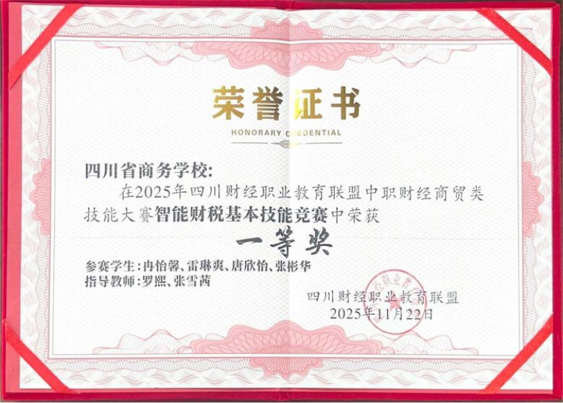 2025年11月22日,四川财经职业教育联盟中职财经商贸类技能大赛“智能财税基本技能”赛项圆满落幕。我校会计专业参赛队伍在学校领导的高度重视下,在指导教师的竭力指导下,不畏全新赛制的难度,以426.2的高分力压群雄,从全省十支参赛队伍中脱颖而出,成功斩获第一名,为学校赢得了荣誉。