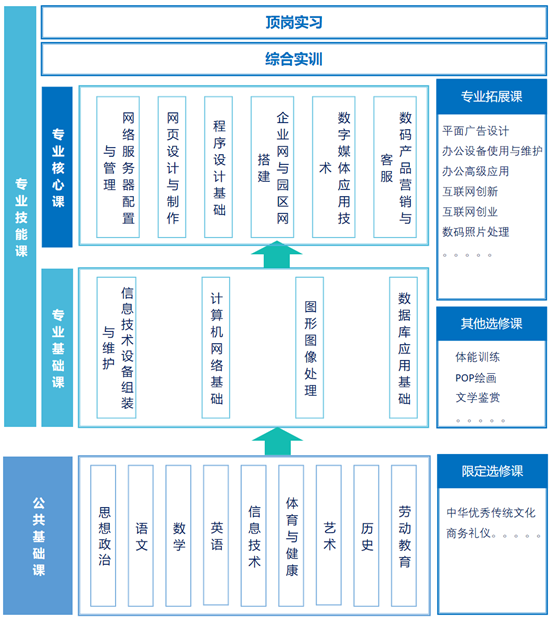建设方案中强调“计算机应用专业赋能商贸行业,构建数字化软硬件基础,助力实现数字化运营,推动商贸行业数字化发展”,本方案严格执行“公共基础课程+专业群平台课程+专业基础课程+专业核心课程+专业拓展课程”课程体系,遵循现有学生的特点,积极推进教学内容和方法的改革,以突显专业特色,并为学生成长和发展提供更加有针对性的支持。