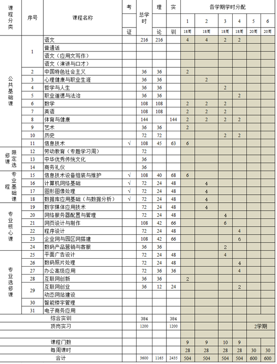 注:学期教学课时的计算只含理论课、实训课、考试、学期机动、顶岗实习的实际课时,其他教学环节所占课时未计入。