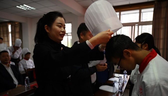 授帽仪式将活动推向高潮。在各方领导见证下,47名新生庄严佩戴上象征职业起点的厨师帽。这一神圣时刻标志着他们正式开启烹饪艺术的人生新篇章,洁白的厨师帽不仅代表着洁净与纪律,更承载着责任与使命。
