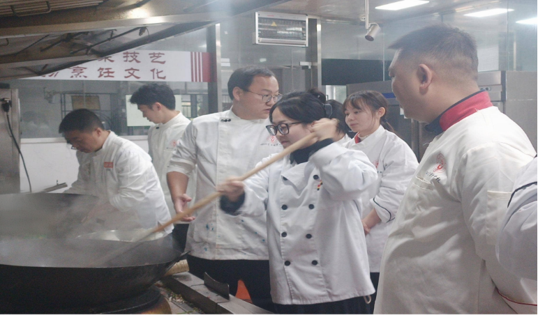 同时,本次活动紧扣“蓝青工程”培养目标,采用“理论+示范+实操”模式:骨干教师参与标准化制作过程,青年教师与实习教师分别参与实操,郑存平主任针对操作中的问题实时指导,重点纠正“熬煮糊底”“投料时机”等常见误区,帮助青年教师快速掌握核心技艺。