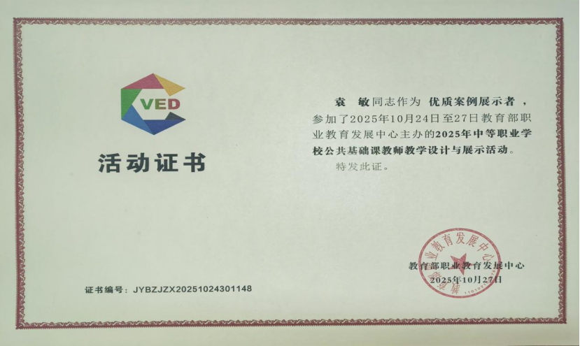 2025年10月,一场聚焦中等职业学校公共基础课教师教学设计与展示活动在青岛火热举行。我校教师袁敏作为四川省体育与健康代表队的成员之一,凭借卓越的教学能力和不懈的努力,在活动中脱颖而出,荣获优质案例展示者证书,为学校和四川省职业教育赢得了荣誉。