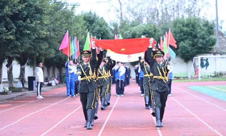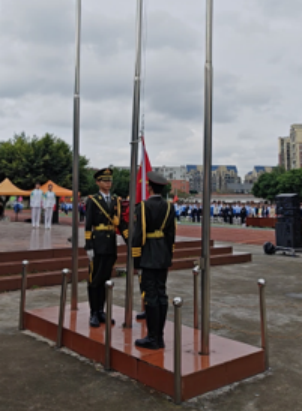 入场式结束后,全体人员肃立,高唱中华人民共和国国歌。在雄壮激昂的国歌声中,五星红旗冉冉升起,全体师生凝视国旗,爱国情怀与集体荣誉感在心中激荡。
