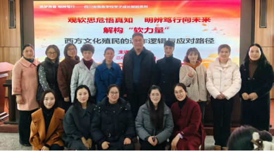 为引导中职学生洞悉文化传播背后的深层逻辑,筑牢文化自信根基,12月11日下午,我校基础教学部思政组“筑梦青春・明辨笃行”系列主题讲座第二站在学术报告厅如期举行。本次讲座以“解构‘软力量’:西方文化殖民的运作逻辑与应对路径”为主题,由我校颜莎莎老师主讲,24级、25级上百名学生现场聆听,党委委员、副校长葛惠伟、质量管理办公室主任杨鑫、基础教学部主任李嘉曦莅临活动现场。