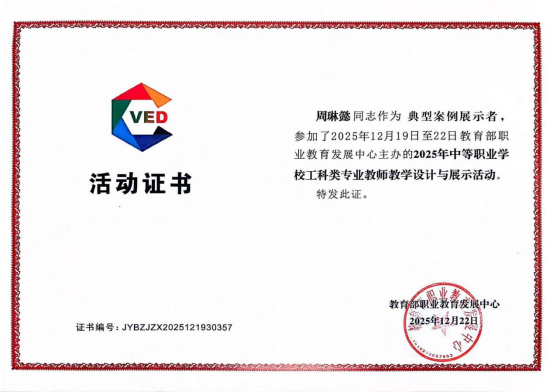 2025年12月19日至22日,我校应用技术系教师周琳懿荣获2025年中等职业学校工科类专业教师教学设计与展示活动“典型案例展示者”称号,质量管理办公室研究员、“计算机程序设计技能大师工作室”张巍老师受邀担任计算机组别的点评专家。本次活动由教育部职业教育发展中心主办、高等教育出版社承办,在福建省福州市举行,作为职业教育课堂教学领域的高规格展示平台,汇聚了全国31个省市的近千名优秀教师同台竞技,旨在深化中等职业学校专业课程教学改革,提升一线教师的教学水平和创新能力,促进教学经验交流与分享。