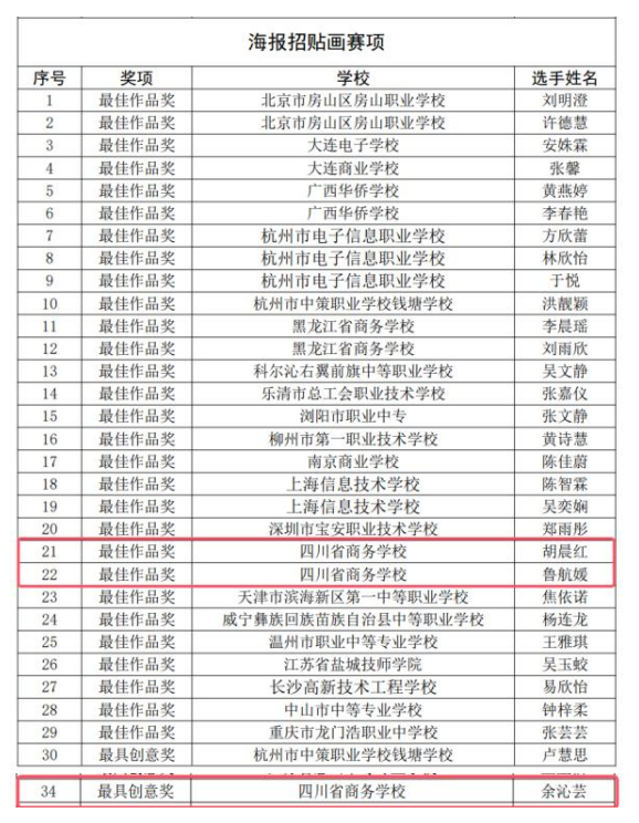 海报招贴画赛项(指导老师—周琳懿):胡晨红(最佳 作品奖)、鲁航媛(最佳作品奖),余沁芸(最具创意奖)