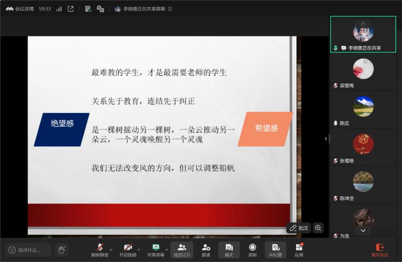 在专题授课环节,国家二级心理咨询师、省级课题主持人李晓惠老师以“以积极心理学之光照亮学生前行的路”为题,展开理论分享。她以“永州奇迹——一支‘三无球队’的冠军之路”案例引入,生动阐释积极心理学激发优势、构建支持环境的核心理念。随后,李老师系统介绍了积极心理学的起源、发展与核心理论,指出其与传统心理学修复问题的区别在于激活优势,致力于提升个体的心理资本与幸福感。针对学生中常见的拖延、逃避等现象,她从发展心理学角度剖析其背后的心理机制,强调建立安全信任的师生关系是促动学生成长的基础。李老师还分享了外化技术、重构技术与找资源找例外技术三项实用策略,助力教师在日常工作中实现从问题关注到优势赋能的转变。