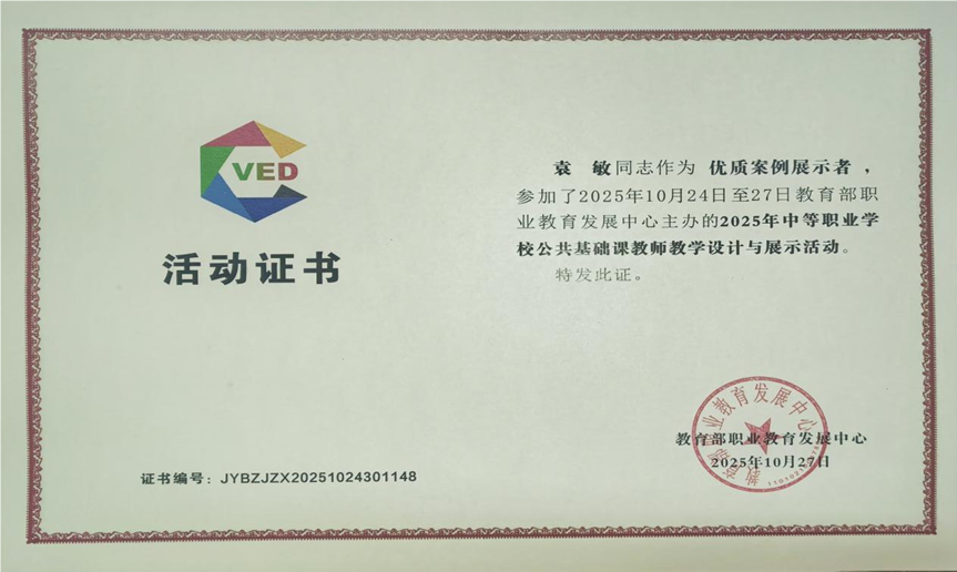 2025年10月,一场聚焦中等职业学校公共基础课教师教学设计与展示活动在青岛火热举行。我校教师袁敏作为四川省体育与健康代表队的成员之一,凭借卓越的教学能力和不懈的努力,在活动中脱颖而出,荣获优质案例展示者证书,为学校和四川省职业教育赢得了荣誉。