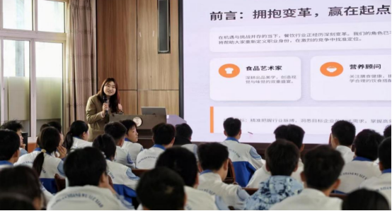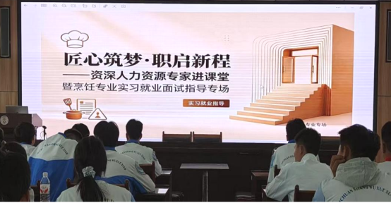 匠心筑梦,职启新程。为深入推进“汇大师智慧・聚行业资源・育烹饪精英”——积极心理+职业素养融合育人系列活动,四川省商务学校烹饪系立足本系主导的市级课题《中职烹饪专业学生“积极心理+职业素养”融合育人策略研究》,持续推动课题研究落地与高素质烹饪人才培养,依托金龙鱼基金会长期公益支持与深度校企合作根基,全面提升烹饪专业学生实习就业核心竞争力。4月22日下午,“匠心筑梦・职启新程”资深人力资源专家进课堂暨烹饪专业实习就业面试指导专场活动在学校学术厅顺利举行。本次活动特邀益海嘉里川渝区域招聘负责人邓丽蓓主讲,为24级即将走上实习岗位的烹饪专业学生开展精准化、专业化就业赋能培训。